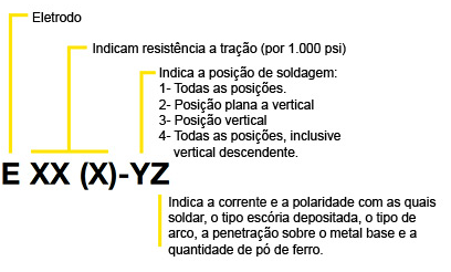 No geral para eletrodos revestidos para aço-carbono, tendo em conta a norma AWS 5.1, podemos verificar que a letra E (imagem abaixo) indica que se trata de um eletrodo revestido. Os dois dígitos seguintes, indicam-nos o limite de resistência, medido em psi. Neste caso, de acordo com a AWS, utilizando o exemplo de um eletrodo classificado como E6013, este corresponde a uma resistência mínima à tração de 60.000 psi (cerca de 42Kg / mm2 ou 415 MPa).