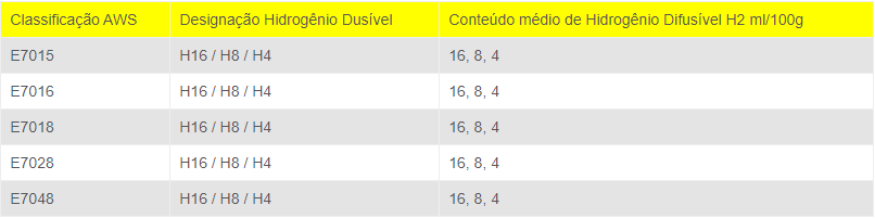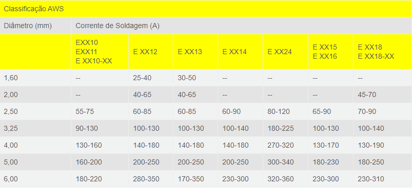 Finalmente, nesta última tabela resumimos a relação entre corrente e diâmetro do eletrodo: