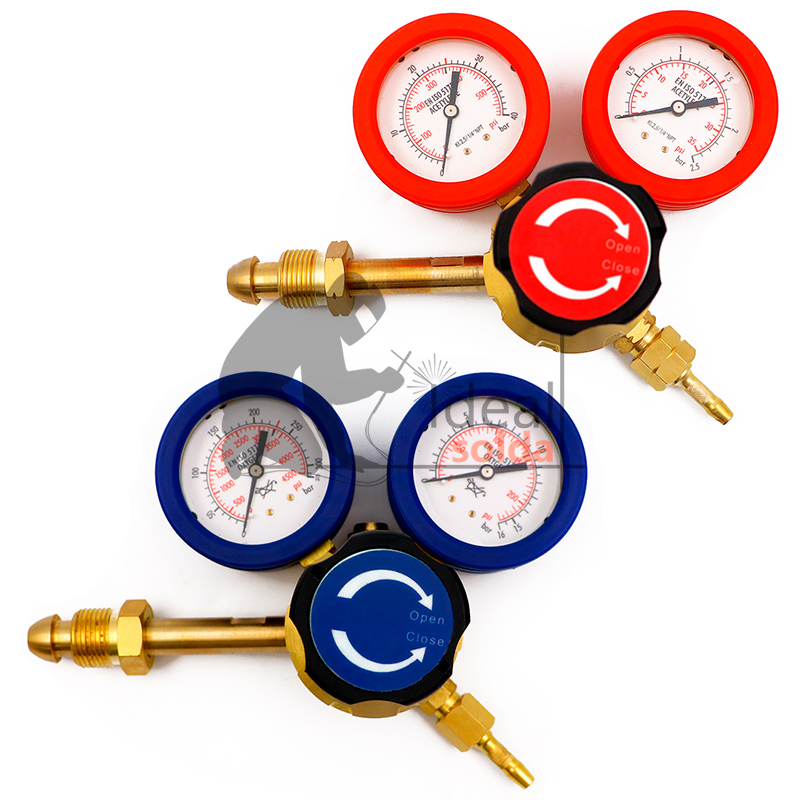 Par de Reguladores debitómetros de fabrico robusto para Acetileno e Oxigénio. Para utilização em processos de corte e soldadura com maçarico.