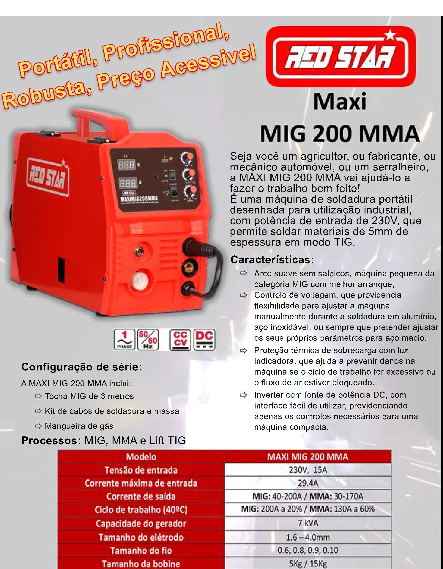 Equipamento monofásico 230V caracterizado como poderoso - 200A em aços de espessura até 10mm, e portátil - apenas 13 Kg de peso.