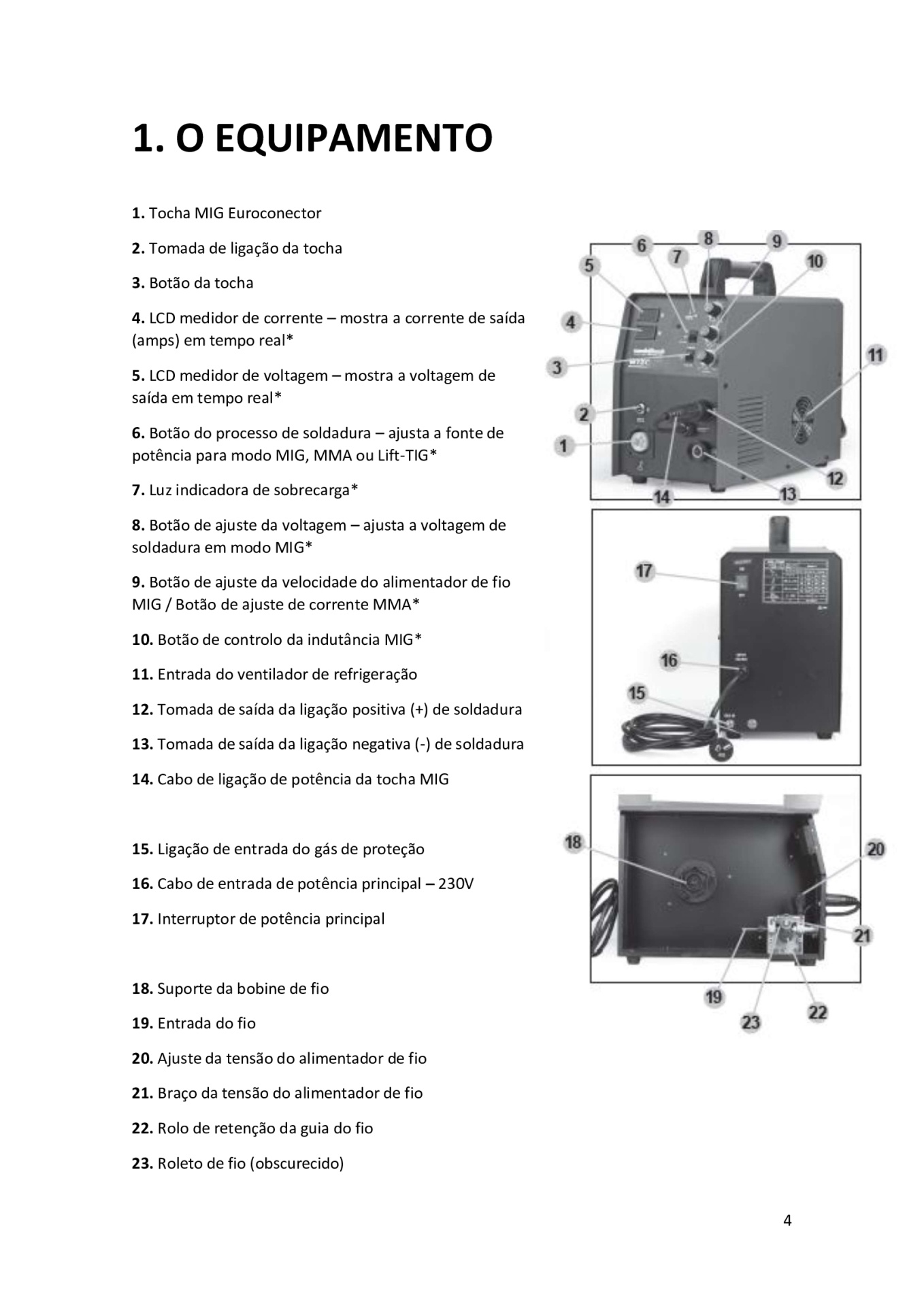 Equipado com tocha MIG, porta-eletrodos e cabo de massa.