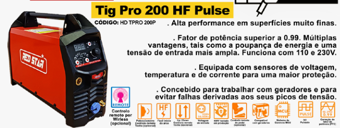 :: 1 Equipamento TIG DC TIG PRO HF PULSE 200 - 230V -TIG:200A/35%; MMA: 200A-35% (Inclui tocha completa , cabo de massa e mangueira de gás )