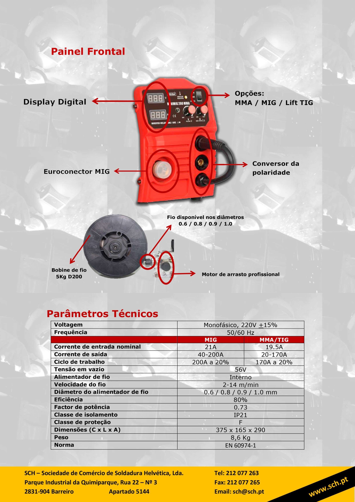 Tecnologia de ponta IGBT Inverter com os processos MIG e Eletrodo. Para bobines até 5 Kg, com e sem gás.
