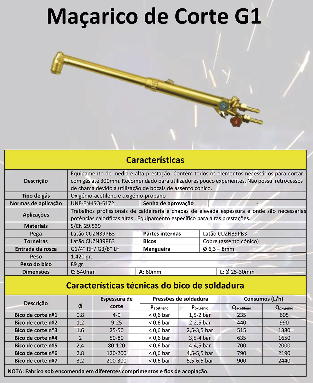 Maçarico de corte tipo G1, para cortar com gás até 300mm.