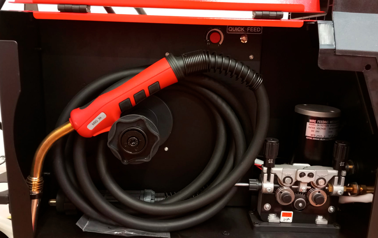 Vem equipada com tocha MIG, porta-eletrodos, cabo de massa e mangueira de gás.