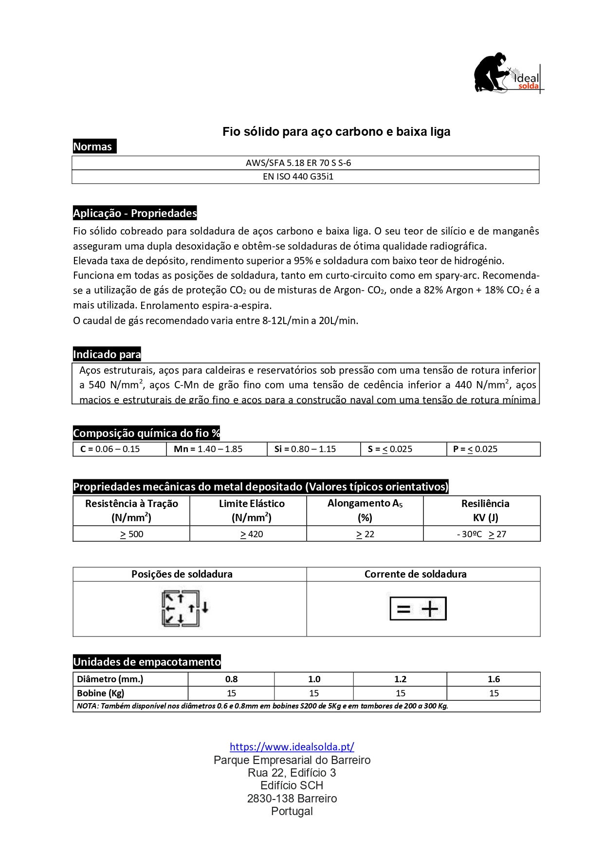 ✔️Muito boa soldabilidade, arco estável e baixa projeção. Permite obter elevada produtividade no trabalho de Soldadura.