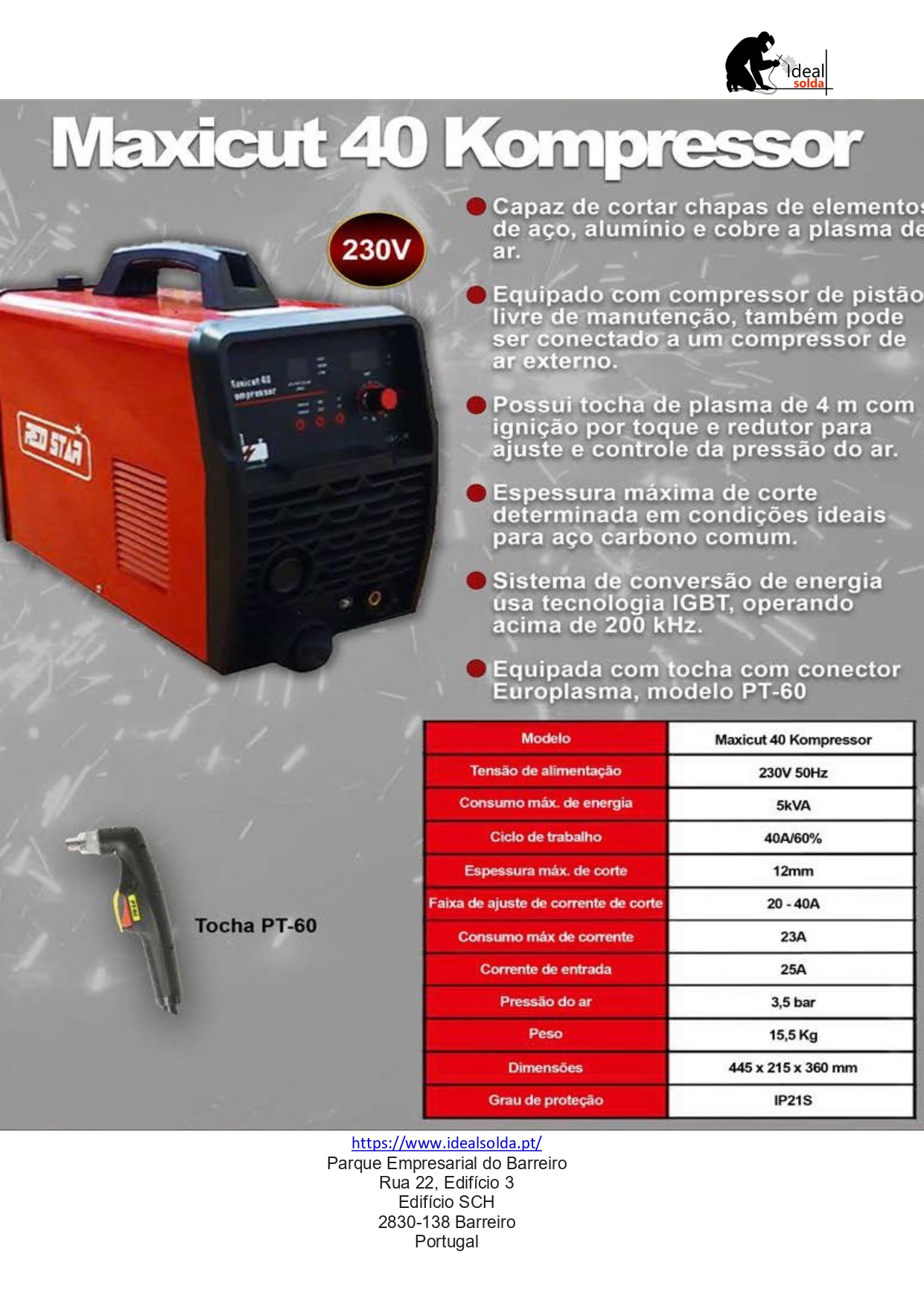 Espessura de corte ideal é até ± 12 mm, em Fe/Aço Carbono e em SS/Aço Inox ± 10 mm , outros metais o corte qualidade desce em media 30%