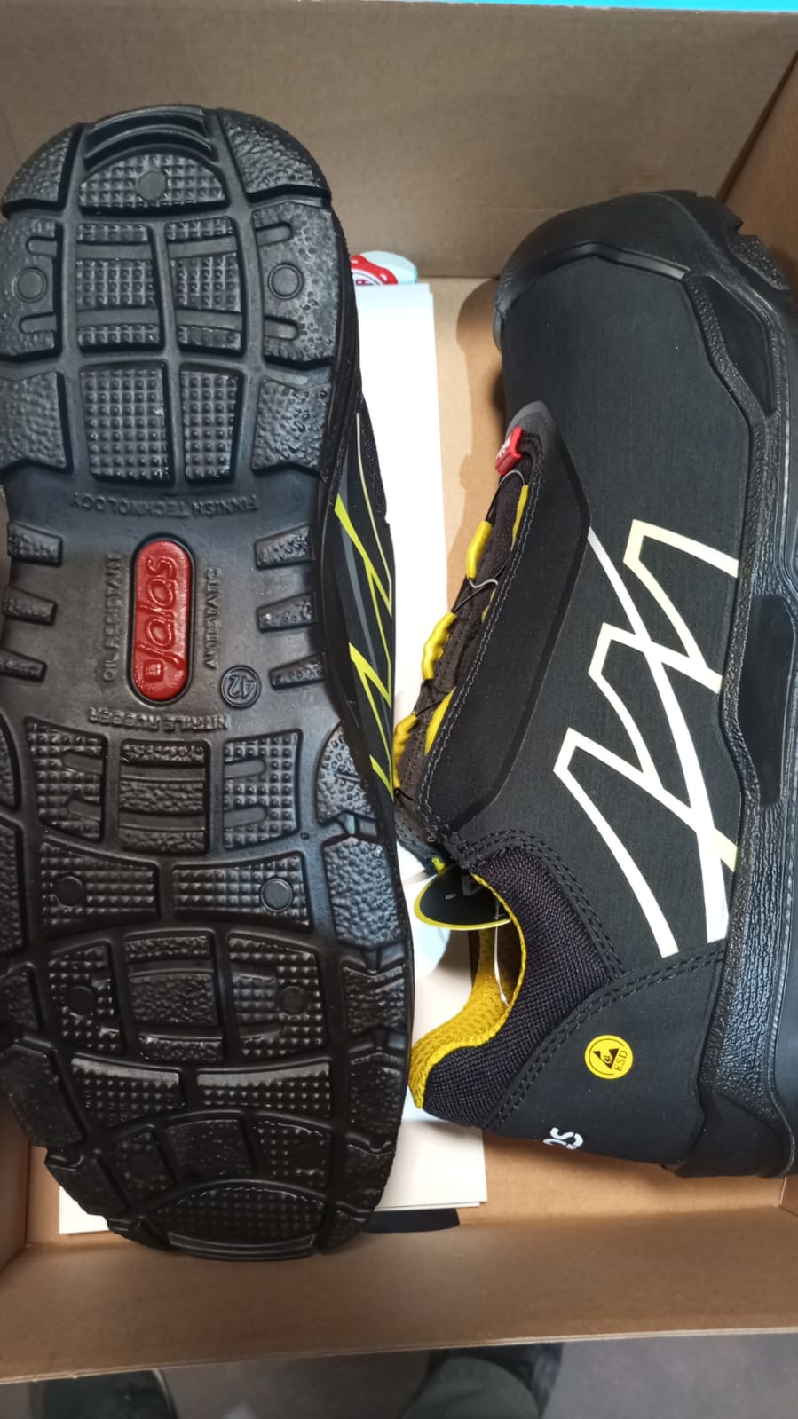 Fecho em velcro, inserção antipregos em aço e biqueira em alumínio. Sola intermédia em PU, sola exterior em borracha e parte superior em cabedal revestido a PU.