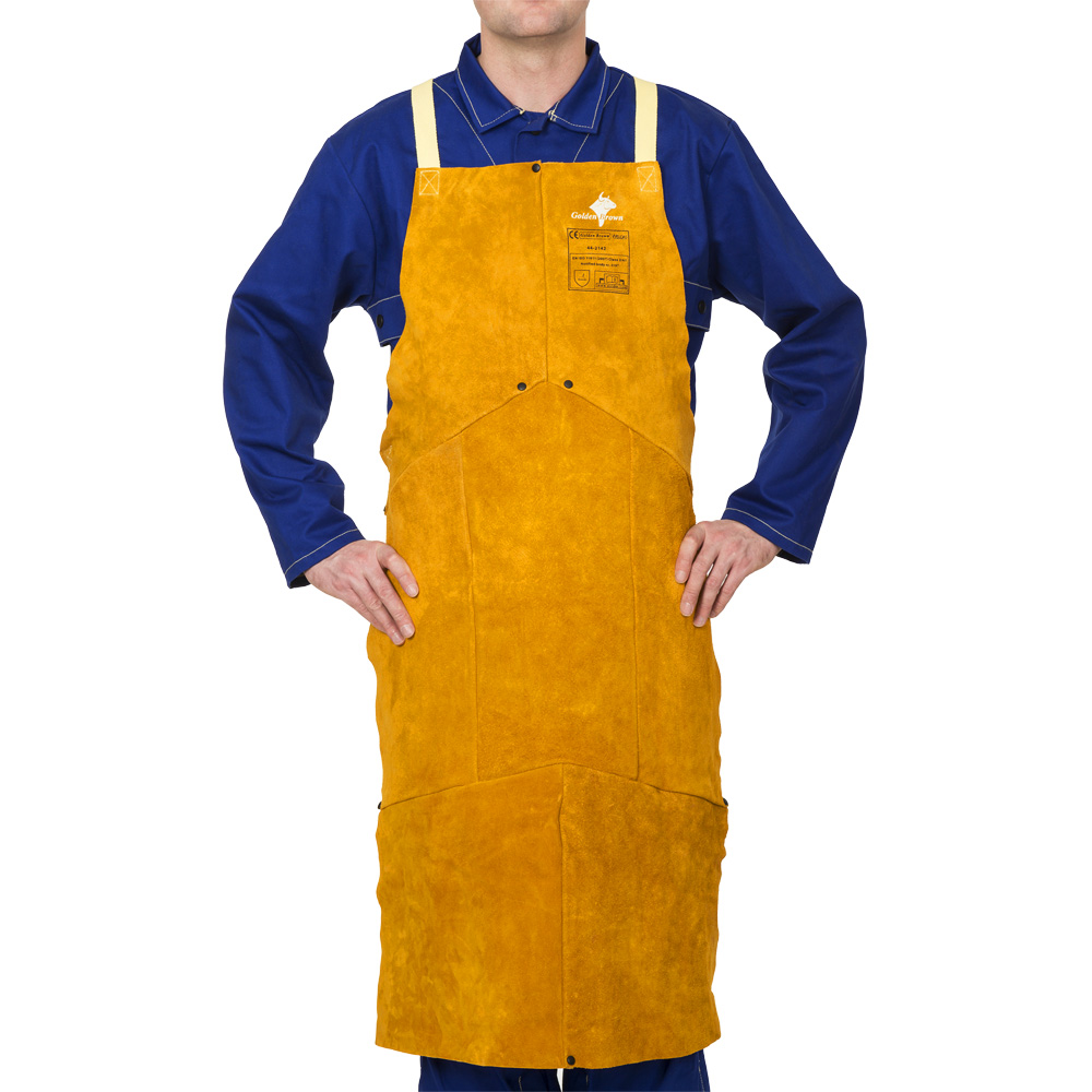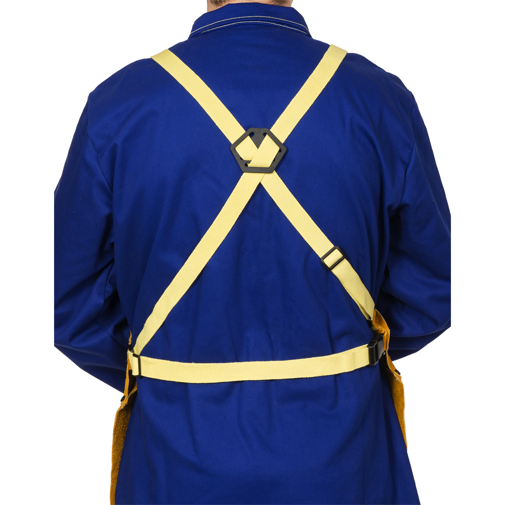 Avental de soldador fabricado em pele de vaca, totalmente ajustável com fecho de mola e com costuras em Kevlar para maior durabilidade.