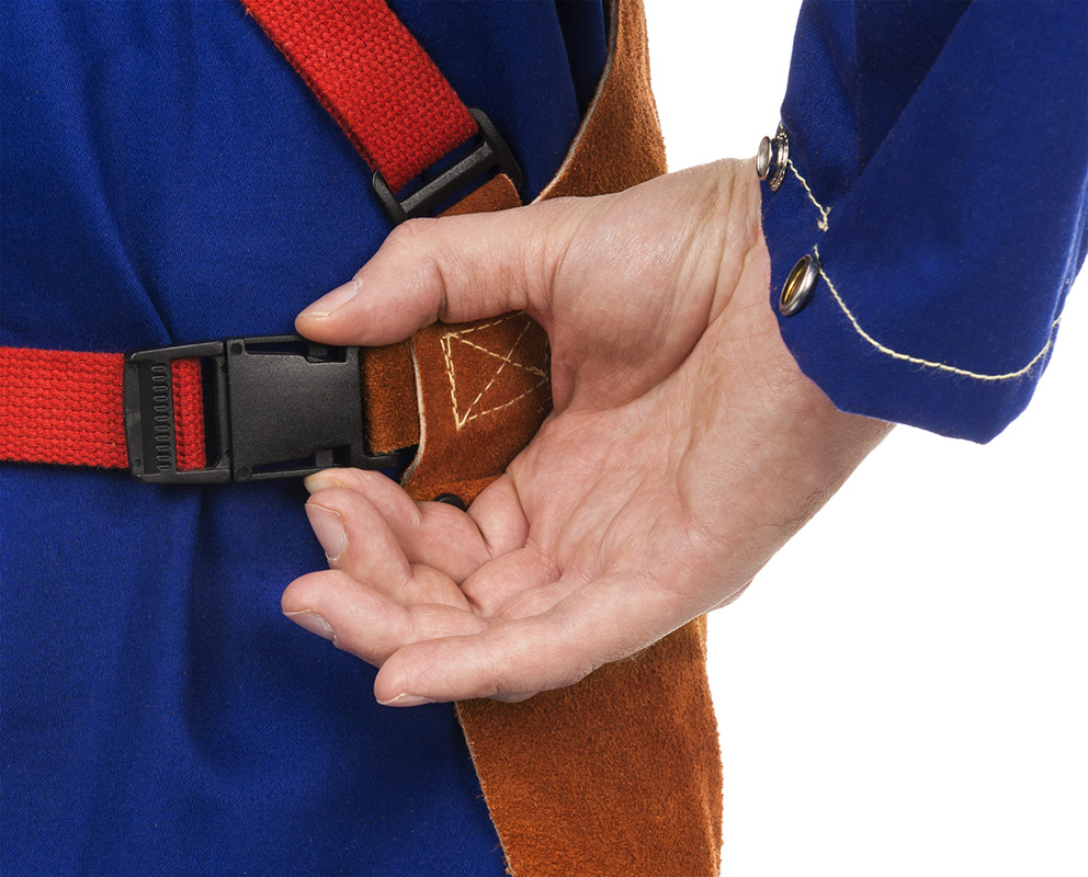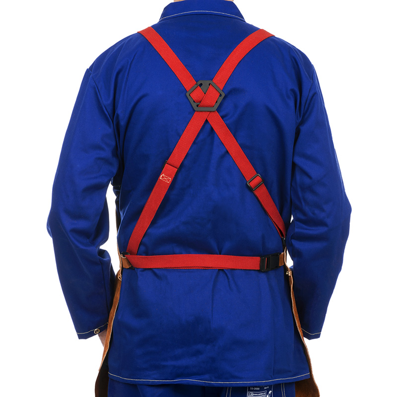 Avental para soldadura fabricado em pele de vaca de qualidade superior. É totalmente ajustável com fecho de mola e com costuras em Kevlar para maior durabilidade.