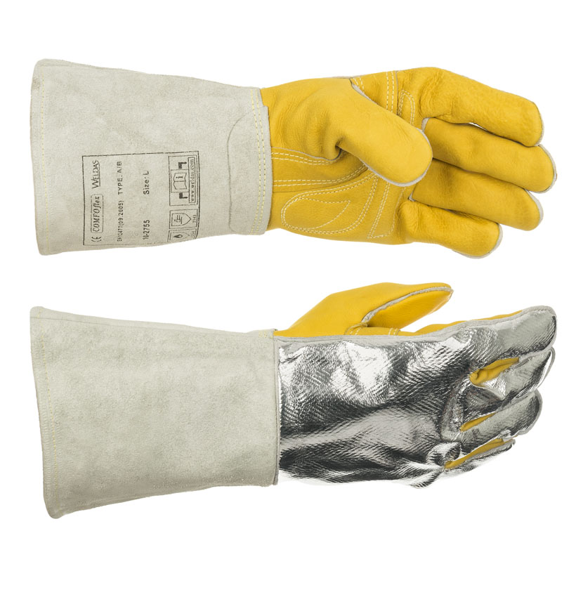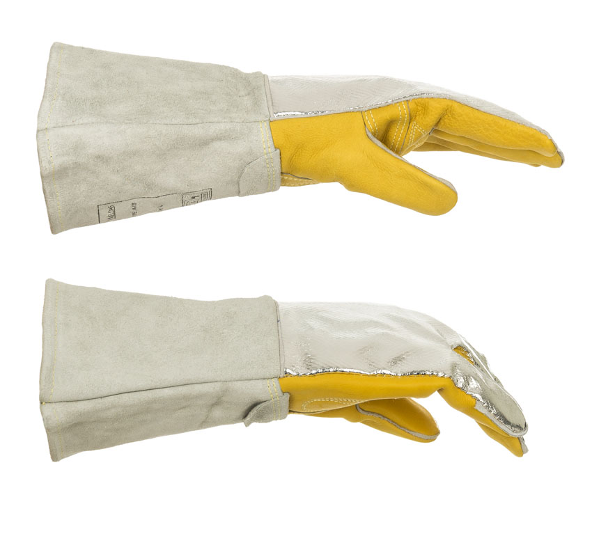 Luva para os Processos MIG MAG Fluxado e ELETRODO, com grande entrega de calor é fabricada em pele de vaca de primeira qualidade. As costas da mão são forradas a alumínio para reflectir o calor radiante a 95% e tem canhão com forro de algodão retardante de chamas.