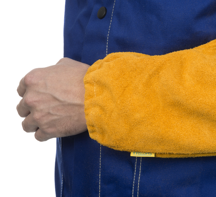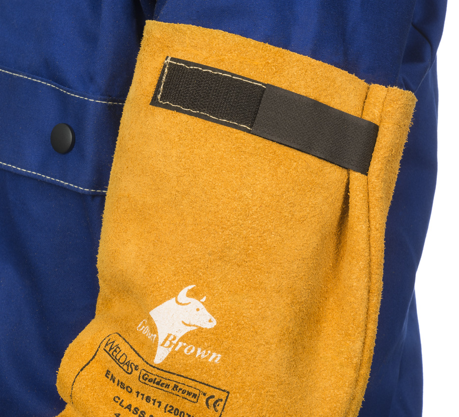 Par de manguitos em pele de vaca, com punho com elástico e fecho ajustado por velcro na parte superior. Possui costuras em Kevlar para maior durabilidade.